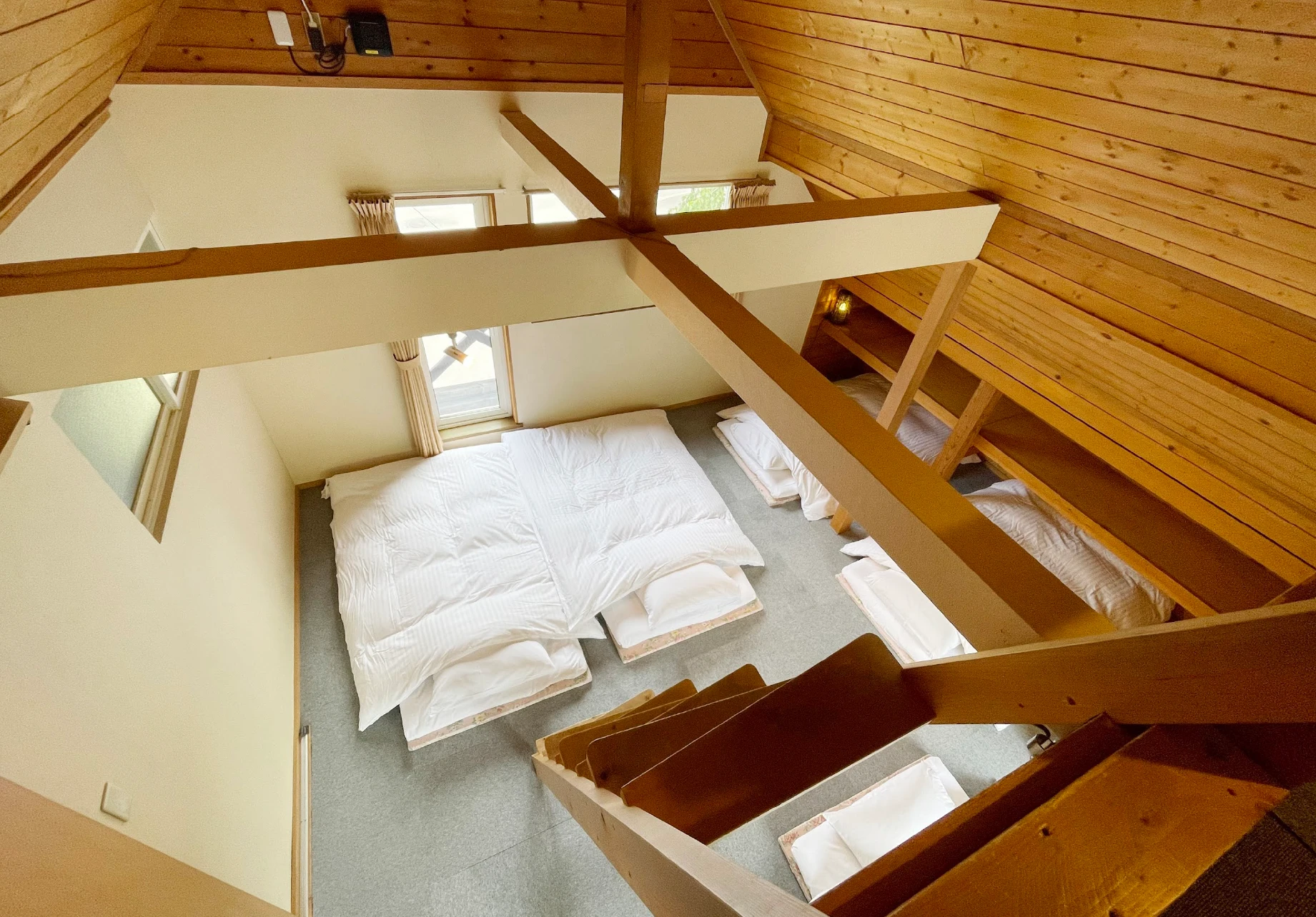 | 設備 | リビングダイニング、キッチン、トイレ、浴室、寝室、各種調理器具、各種食器、冷蔵庫、電子レンジ、炊飯器、トースター、テレビ、ストーブ、エアコン、ドライヤー、寝具一式、Wi-Fi |
